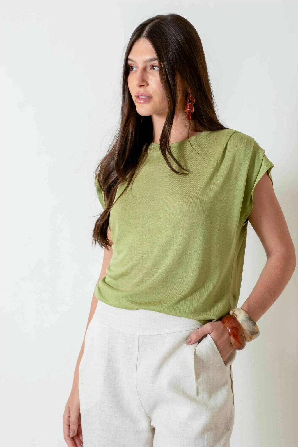 O decote redondo clássico harmoniza com o detalhe de pregas nos ombros, que adiciona um sutil volume e valoriza a silhueta de forma discreta. A modelagem ampla garante liberdade de movimento e versatilidade para compor desde produções casuais até looks mais arrumadinhos com poucos complementos.