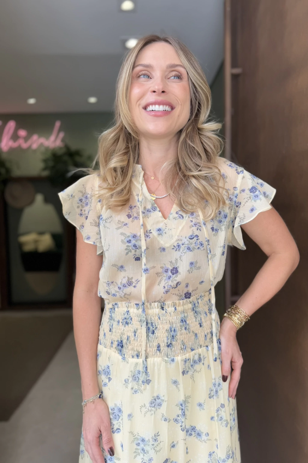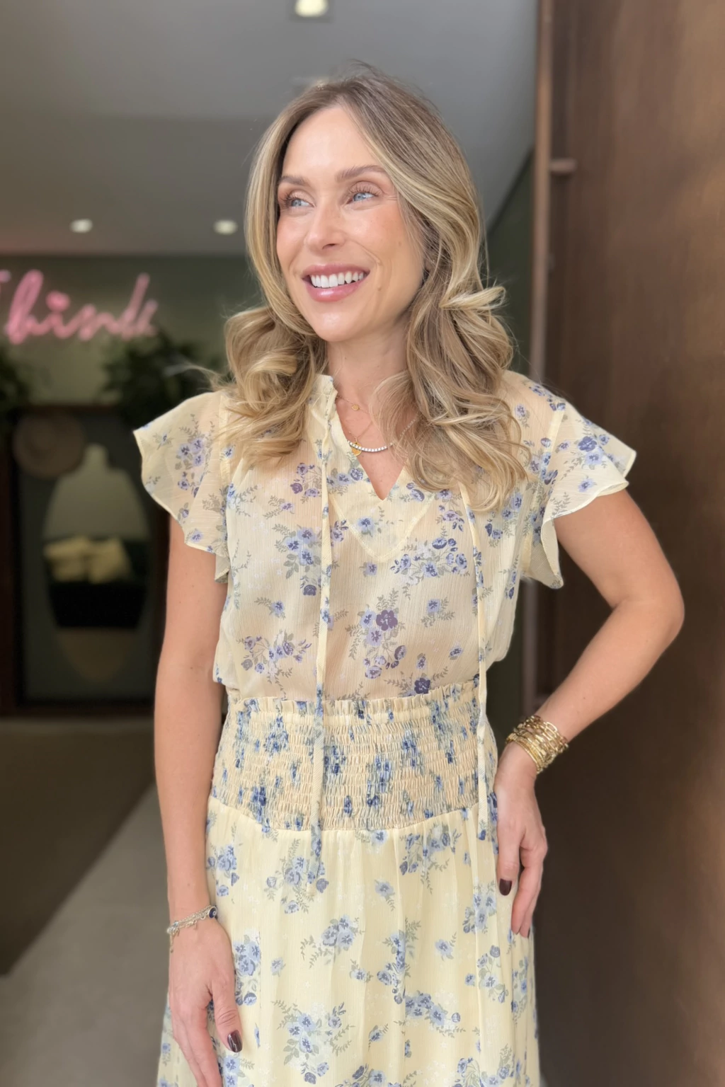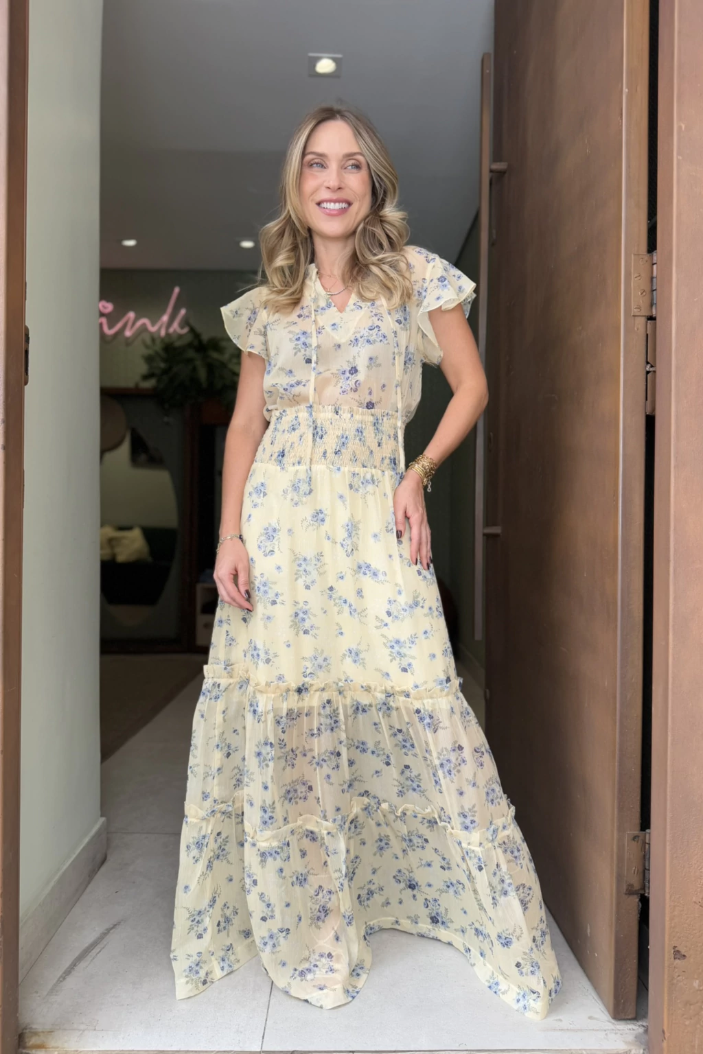 As mangas curtas com babados acrescentam charme imediato, equilibrando suavidade e presença. O decote em V com amarração fina oferece versatilidade — você regula conforme o estilo do dia, seja para produções mais delicadas ou combinações modernas com peças de alfaiataria. Uma escolha perfeita para dias luminosos, encontros casuais e looks de meia-estação que pedem elegância natural.
