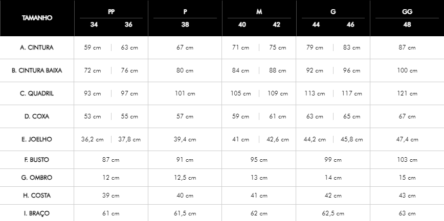 Medidas da modelo: Altura 1,76m • Busto 78cm • Cintura 64cm • Quadril 96cm