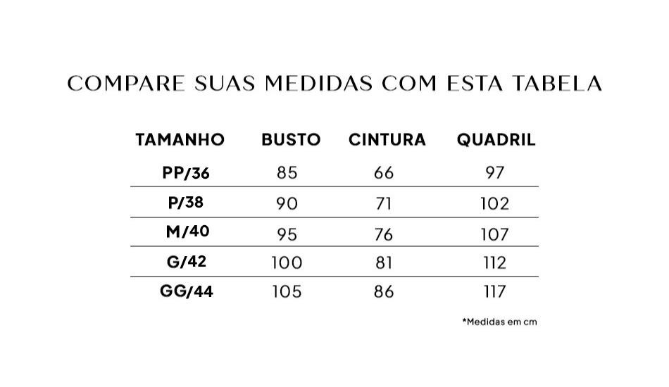 Modelo veste 38 | 1,81m | Busto 86 cm | Cintura 64 cm | Quadril 93 cm