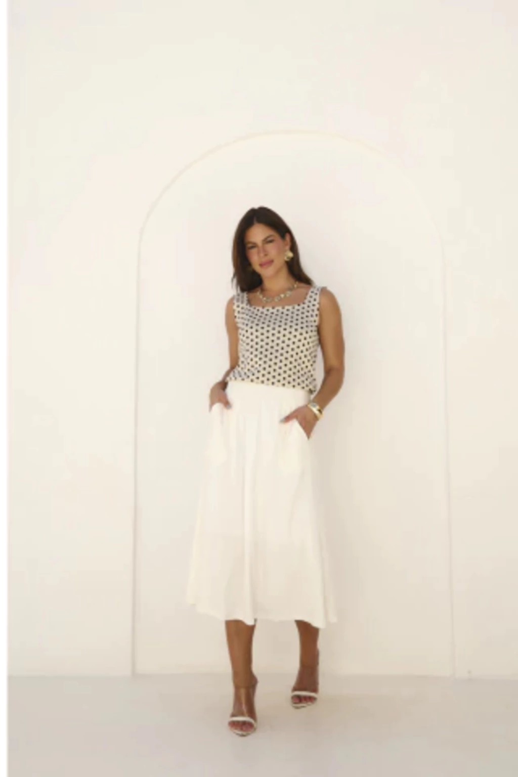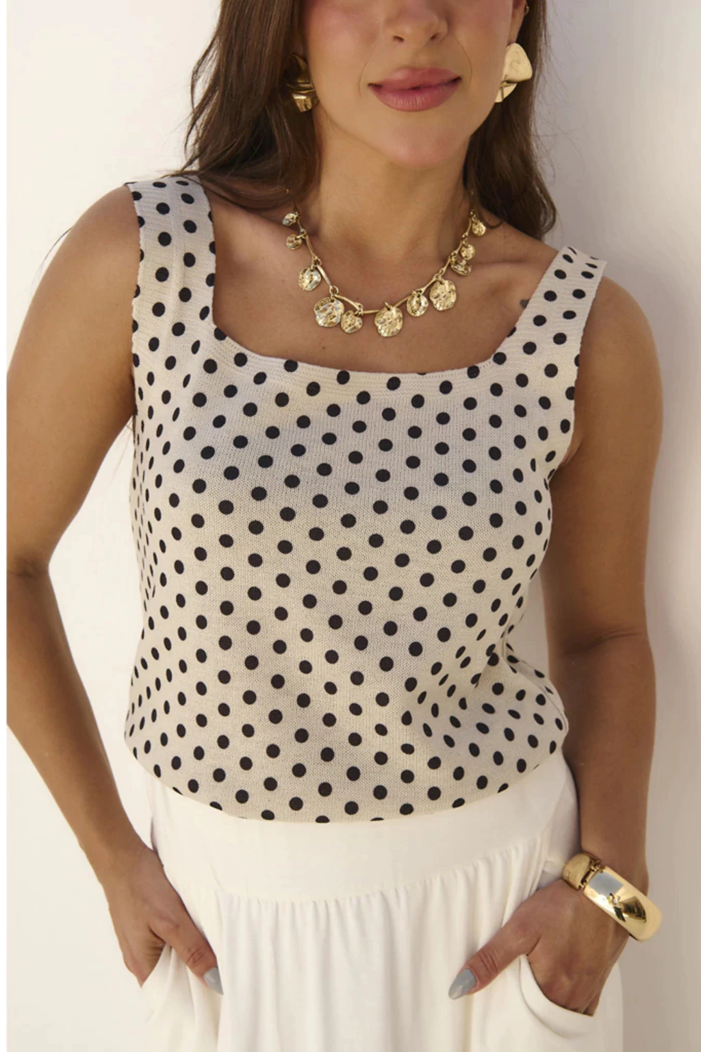 Ideal para o clima brasileiro, a peça combina frescor e versatilidade, podendo ser usada sozinha em dias mais quentes ou como base para sobreposições em visuais de meia-estação. A acabamento refinado e o brilho sutil do tricot reforçam a estética clean e atemporal — perfeita para quem valoriza praticidade e bom gosto em cada detalhe.