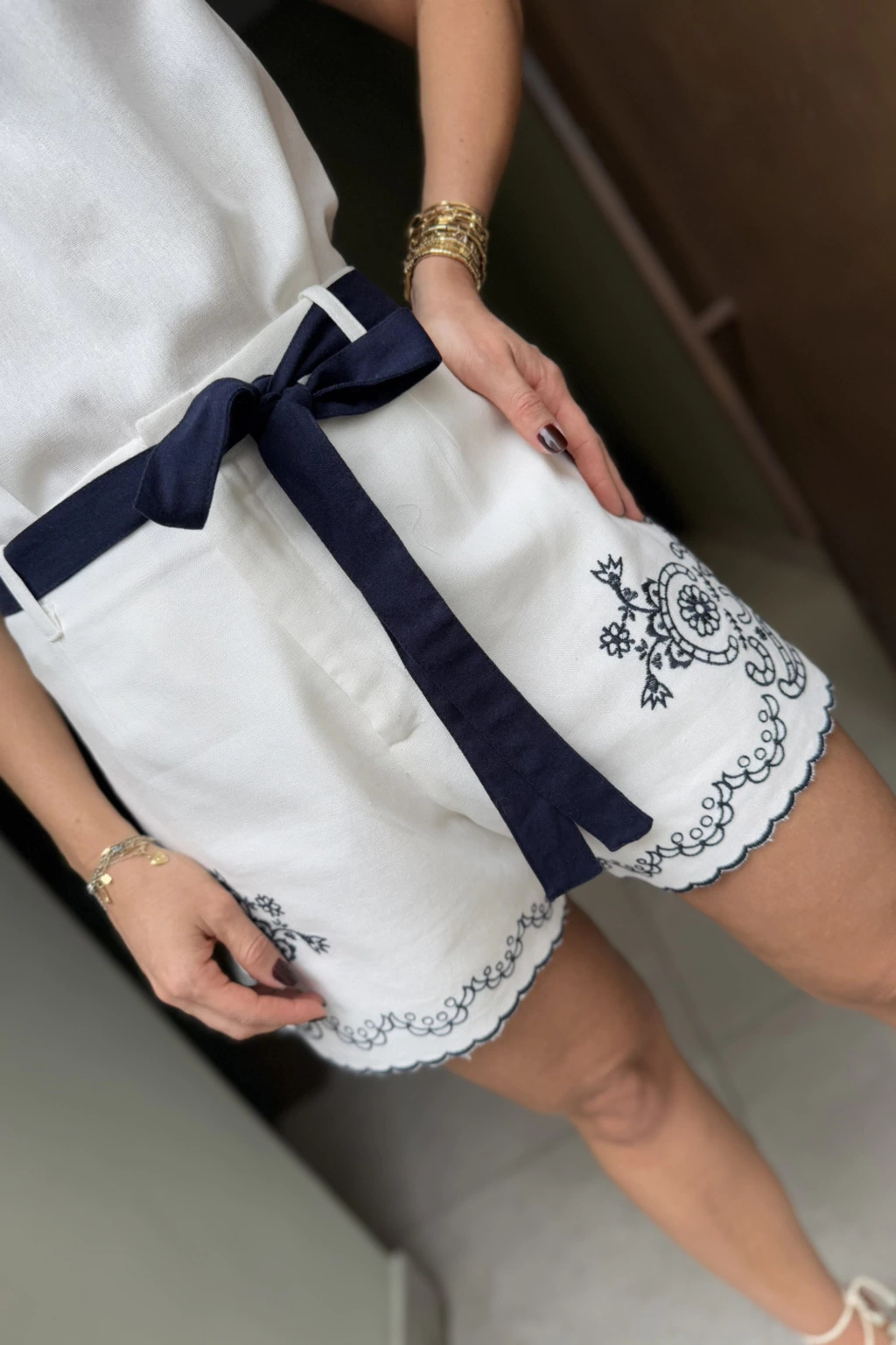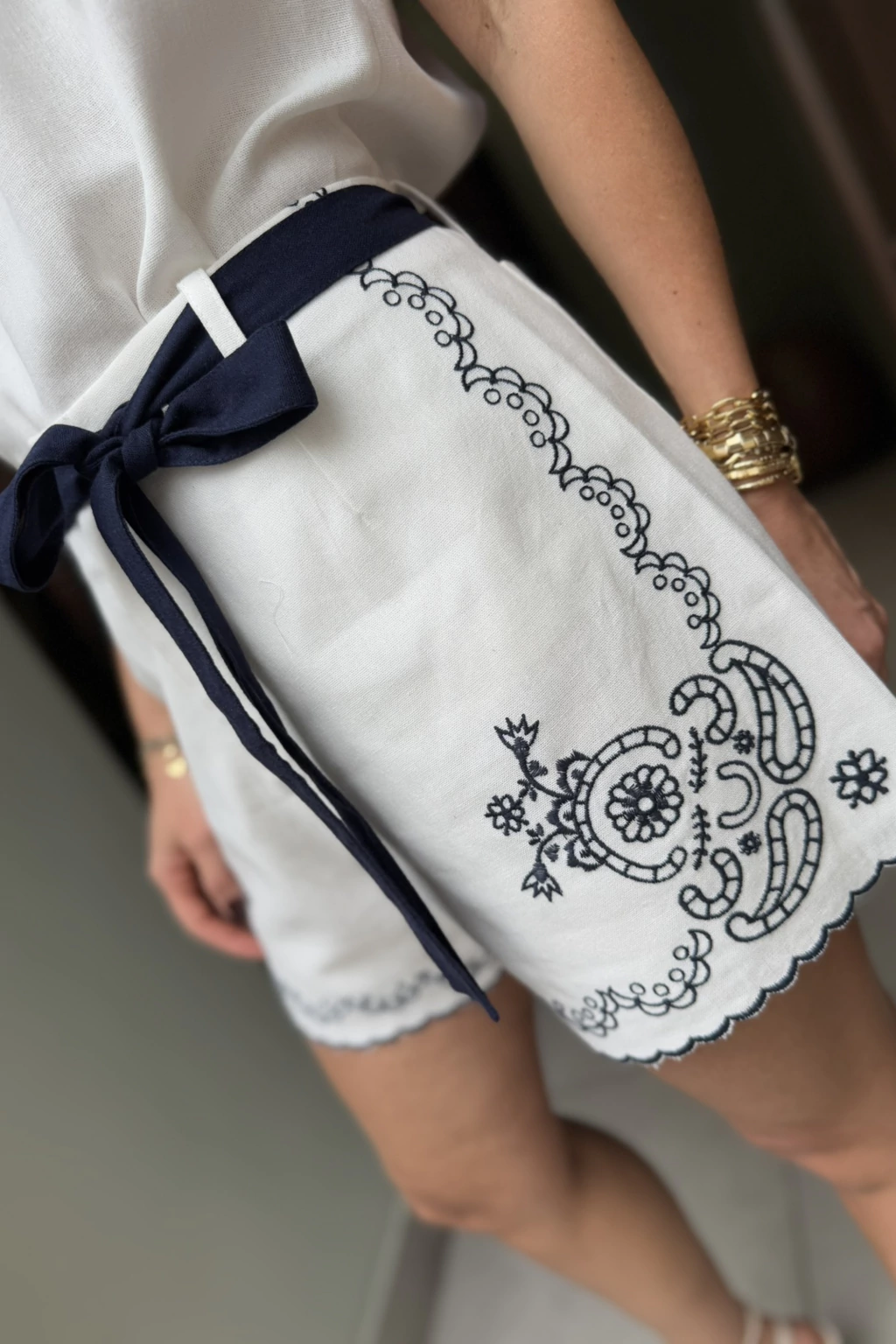 O Short Cashflor, da Think, é uma peça charmosa e fresca que une estilo artesanal e sofisticação casual. Confeccionado em tom off-white com bordados azul-marinho, traz um contraste elegante que remete ao universo mediterrâneo. O barrado ondulado com acabamento bordado adiciona delicadeza, enquanto a faixa na cintura, também em azul-marinho, permite ajustar o look com um toque feminino e moderno.