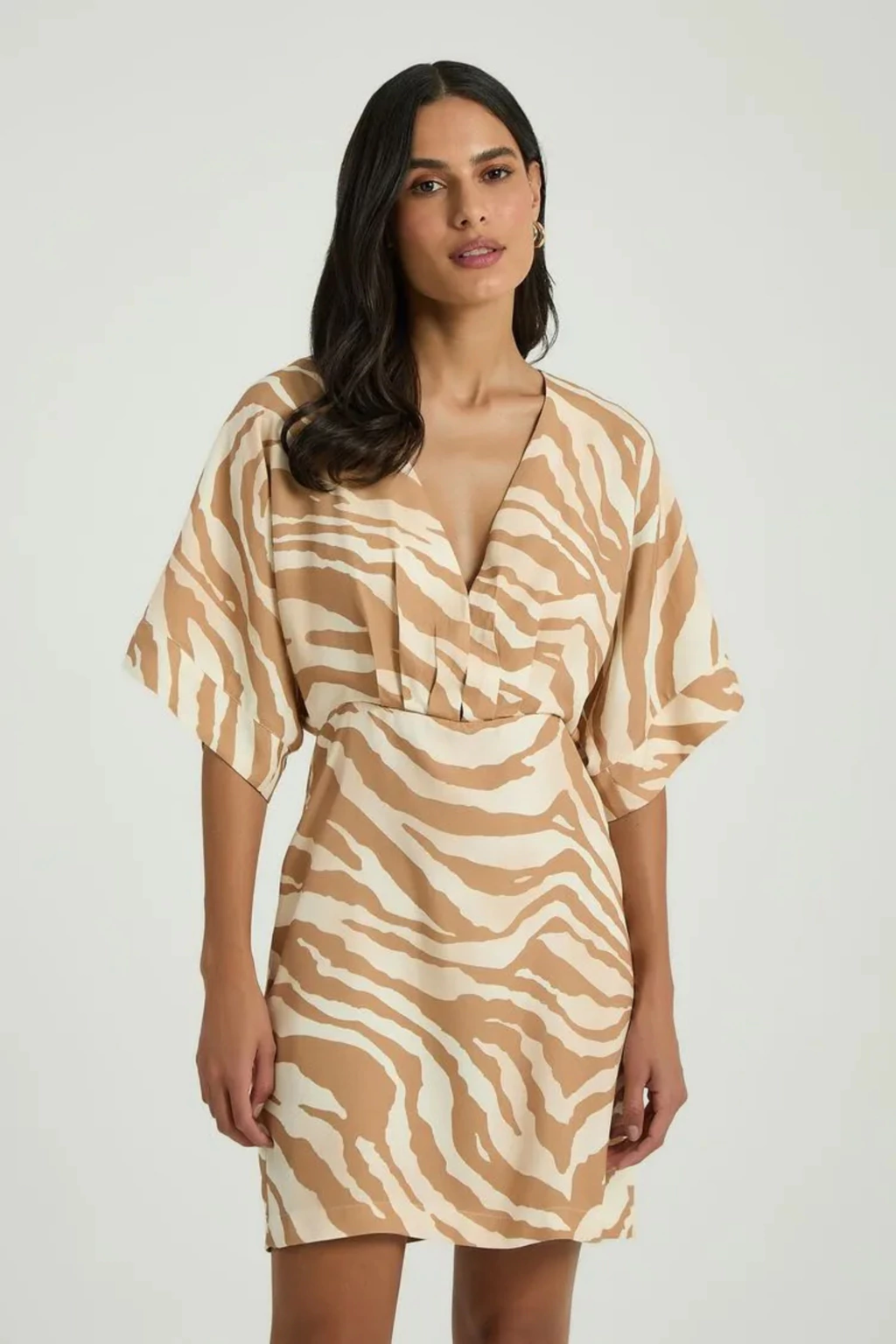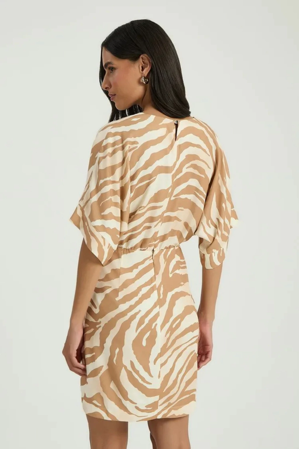 O Vestido Curto Estampado Zebrado My Place traduz modernidade e feminilidade em uma peça única. Seu decote em V com pregas no busto valoriza a silhueta de forma delicada, enquanto as mangas curtas levemente amplas adicionam leveza e movimento ao visual. O zíper traseiro garante praticidade e um caimento impecável.