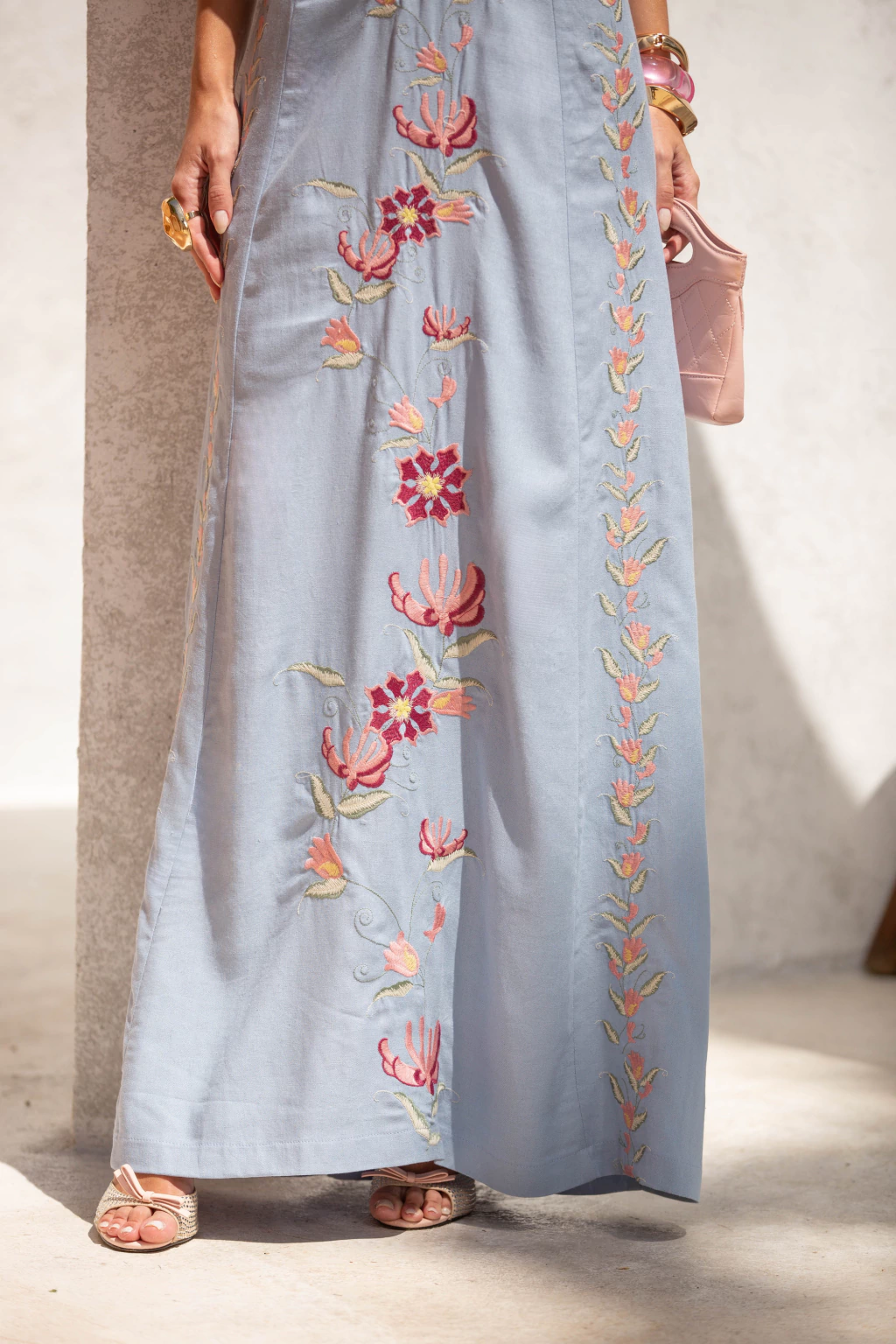 O Vestido Floral Rosa, da Think, é uma peça que combina delicadeza e presença em um visual marcante e romântico. Seu tom azul suave cria uma base elegante para os bordados florais multicoloridos, que percorrem a peça verticalmente e alongam a silhueta com naturalidade. O desenho artesanal das flores traz textura rica e destaque vibrante, valorizando o look de forma sofisticada.