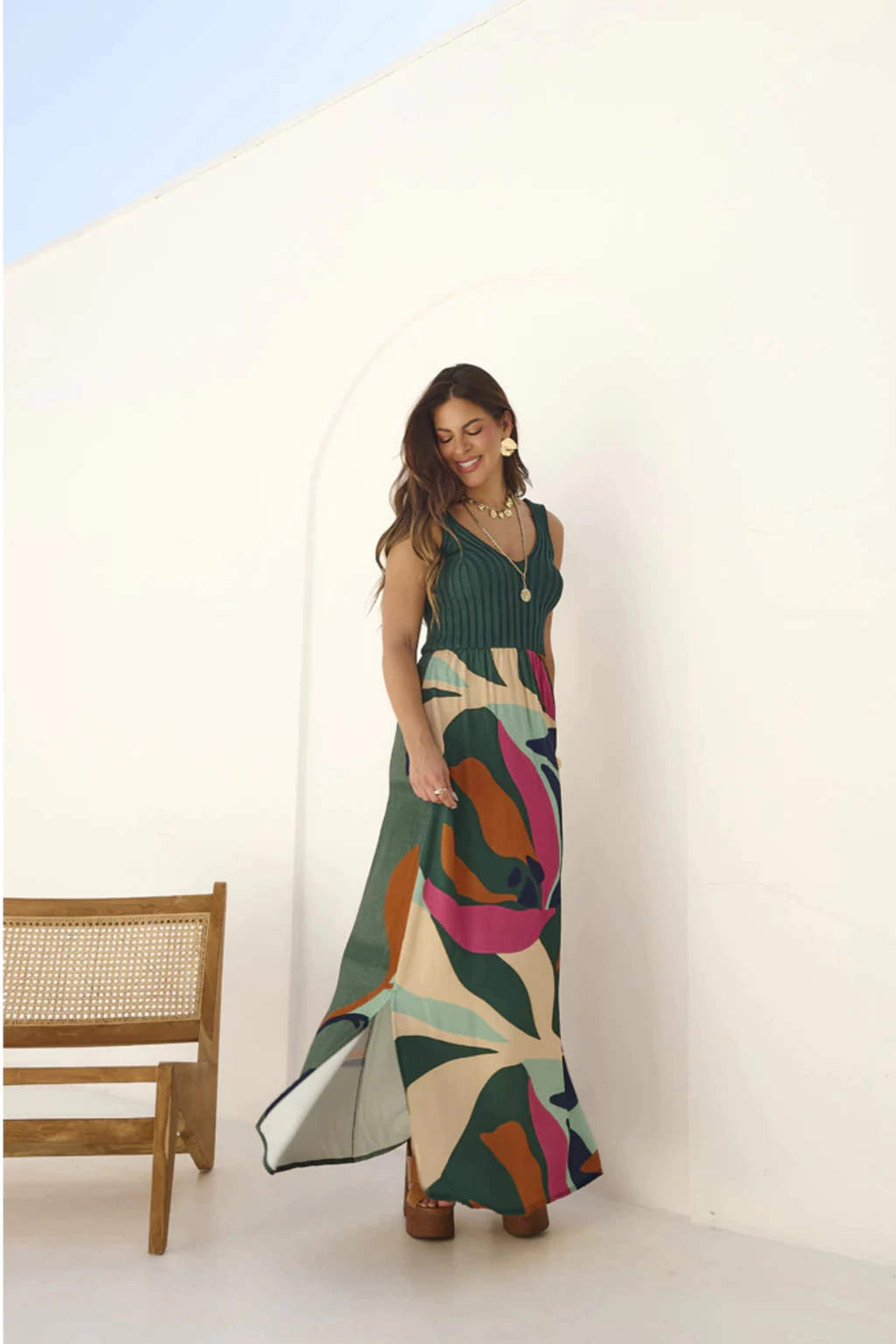 O top em tricot, de toque macio e caimento ajustado, valoriza a silhueta com delicadeza e sofisticação, enquanto a saia em tecido leve e estampado traz frescor e dinamismo ao look. A modelagem regata reforça o ar descontraído e garante liberdade de movimento, tornando o vestido ideal para dias quentes ou eventos ao ar livre.